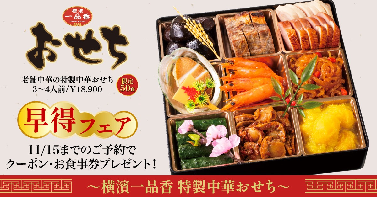 横濱一品香 『特製中華おせち』予約販売開始! 新年のお祝いは老舗『横濱中華』のおせちで。 【限定50食/送料無料】横濱一品香 特製中華おせち 18,900円(税込)(冷蔵品)(3〜4名様用) ※早得は終了しました。 早得期間にご予約いただくと ■一品香店舗でのお食事券3,000円分 ■オンラインショップで使えるクーポン1,000円分 がついてきます!!! >> 詳しくはこちら